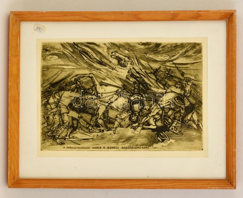 Beschreibung: Jelzés nélkül: A parasztseregek harca a nemesi bandériumokkal, rézkarc, papír, paszpartuban, üvegezett fa keretben, 20×30 cm