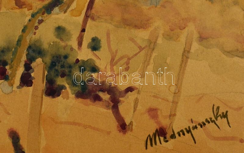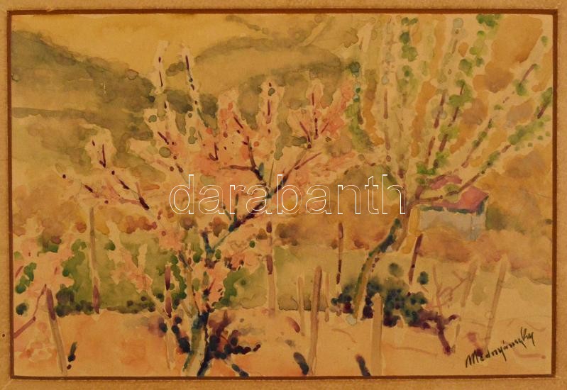Beschreibung: Mednyánszky jelzéssel: Virágzó barackfák, akvarell, papír, paszpartuban, 20×29,5 cm