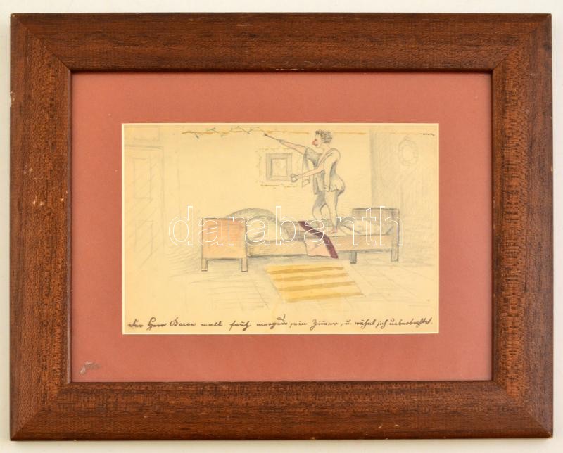 Beschreibung: Olvashatatlan jelzéssel: Festegető beteg. Ceruza-akvarell, papír, fakeretben, 14×21 cm