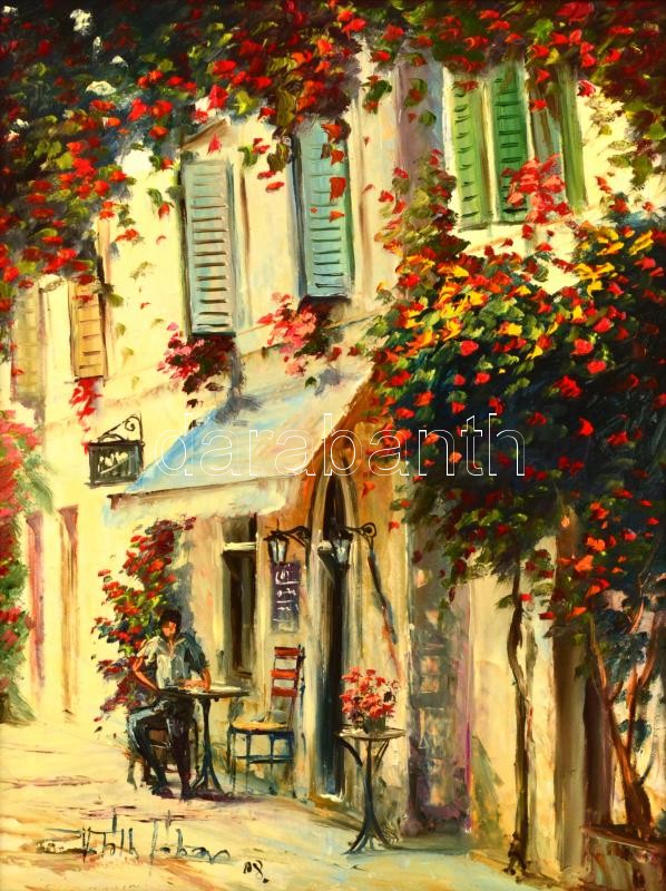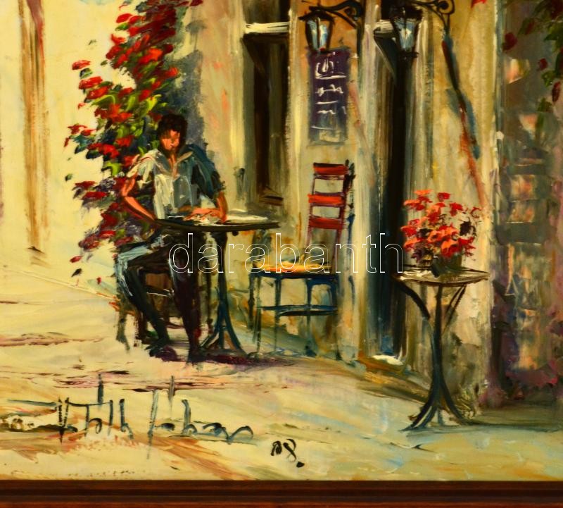 Beschreibung: Tóth Gábor (1967-): Francia utca. Olaj, farost, jelzett, fa keretben, 40×30 cm