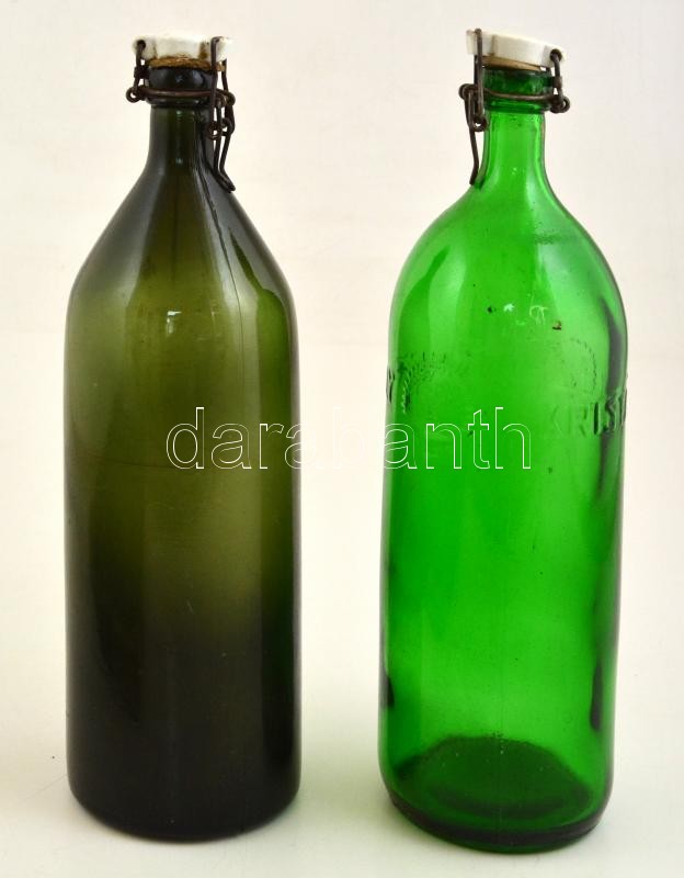 Beschreibung: 2 db régi Kristályvíz palack ( egyik feliratos), csatos zárral, jó állapotban, m: 30 cm (2×)