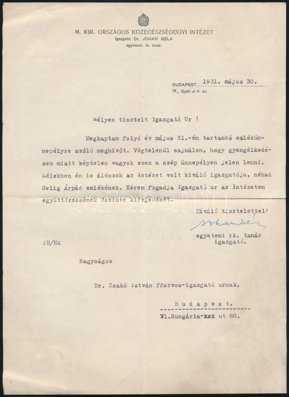 1931 Dr. Johann Béla (1889-1983) a Közegészségügyi Intézet igazgatója által saját kézzel aláírt levél, melyben betegsége miatti távolléte okán elnézést kér