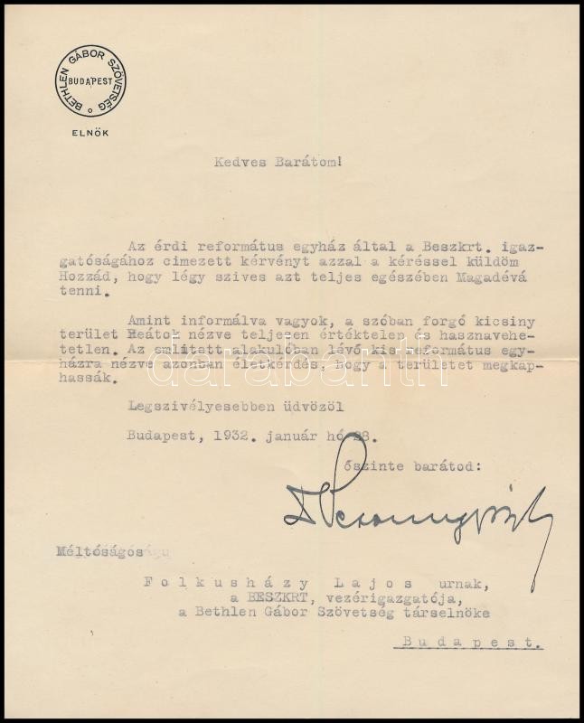 1932 Bethlen Gábor Szövetség társelnökének levele Folkusházy Lajosnak (1868-1939), a BSZKRT vezérigazgatójának, az érdi református egyház nevében, egy terület ügyében, aláírással, a szövetség fejléces papírján, borítékkal.
