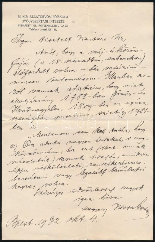1932 Bp., Dr. Magyary-Kassa Gyula (18651944) gyógyszerész, egyetemi tanár, MTA-tag saját kézzel írt és aláírt levele
