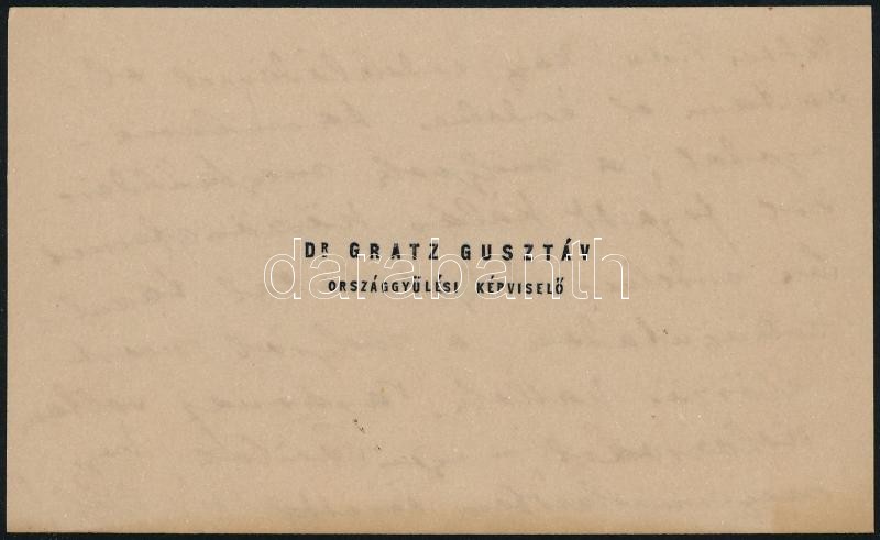 Beschreibung: cca 1920-1930 Dr. Gratz Gusztáv (1875-1946) pénzügy- és külügyminiszter, országgyűlési képviselő névjegye, hátoldalon saját kézzel írt szöveggel