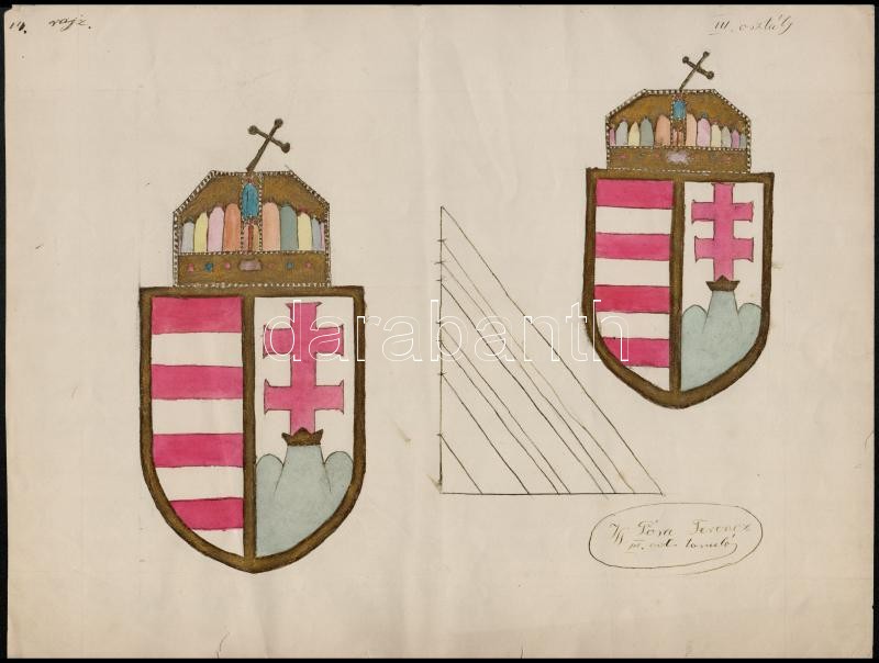 cca 1920 Magyar címerpajzs, iskolai rajz, vegyes technika, papír, 30x39 cm
