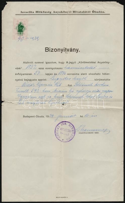 Beschreibung: 1939 Budapest, körülmetélési anyakönyvi igazolás Neumann József óbudai rabbi aláírásával, okmánybélyeggel
