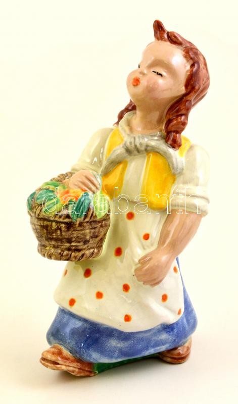 Beschreibung: Komlós kerámia kislány virágkosárral, kézzel festett mázas kerámia, jelzett, m: 23 cm