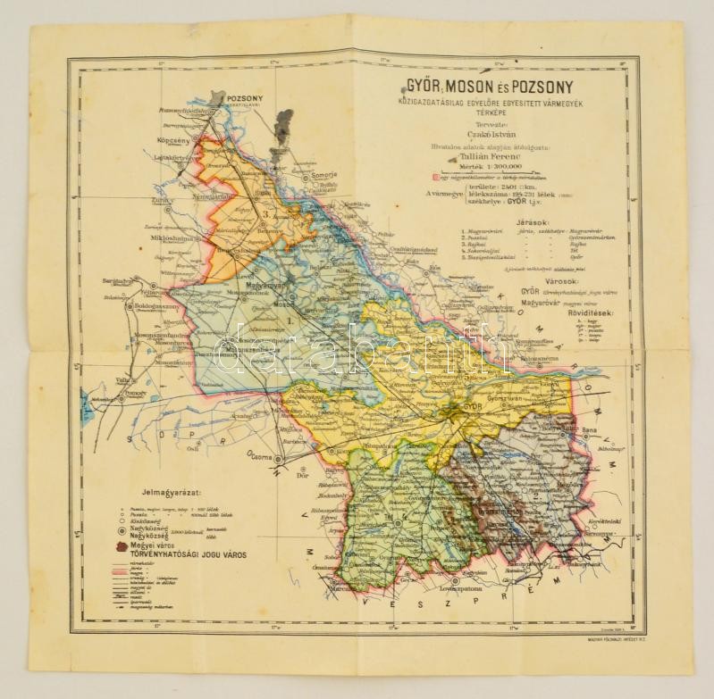 1929 Győr, Moson és Pozsony közigazgatásilag egyelőre egyesített vármegyék közigazgatási térképe. Tervezte: Czakó István. Bp., Magyar Földrajzi Intézet Rt., hajtásnyomokkal, 36x36 cm
