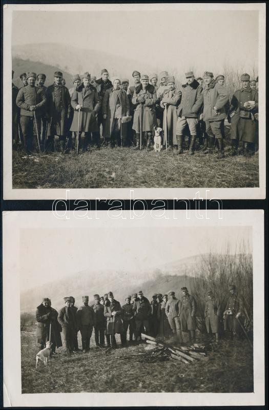 1917 Barátkozás a tábortűznél Karácsony napján, háttérben az Arat heggyel (?), orosz front, 1917.12.24., 2 db. fotó, rajta Várady Albert (1870-?) huszártiszt és kutyája, a m. kir. varasdi 10. honvéd huszárezredből, hátoldalon feliratozva, 9x12 cmx2