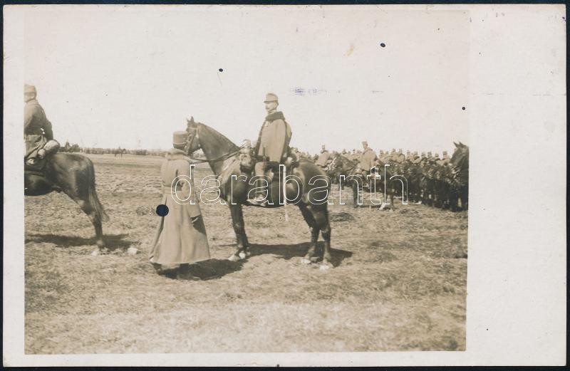 1917 IV. Károly csapatszemlét tart a fronton, fotólap, a hátoldalon feliratozva: "Ő Felsége beszélget Jankovich őrnagy úrral május 4.én, mikor az eredet szemlélte", 9x14 cm