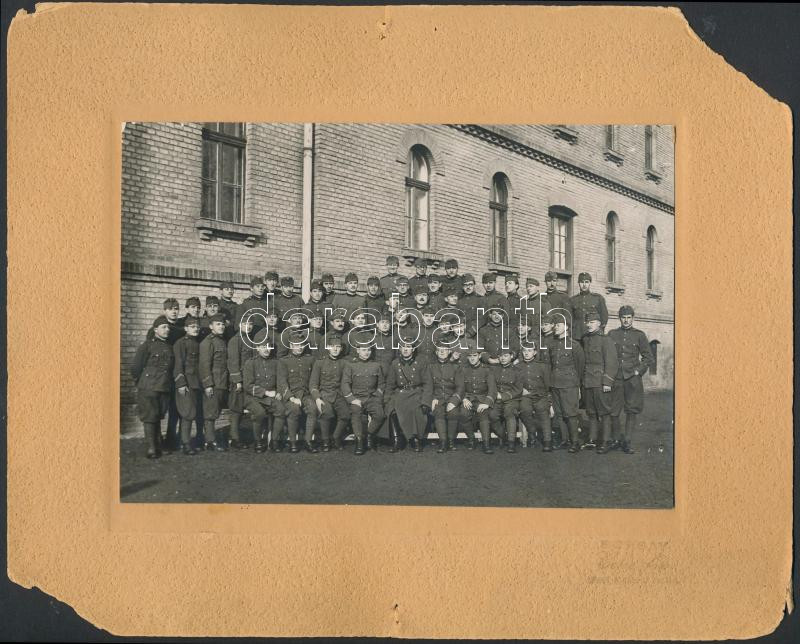 Beschreibung: 1940 Katonai tablófotó, kemény hátú fotó, Borsay color fotó Budapest, a karton sarkai sérültek, hiányosak, de a fotó ép, 20x24 cm.