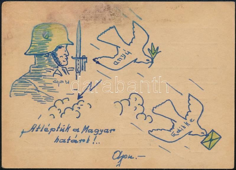 Beschreibung: 1943 Egyedi rajzos tábori posta levelezőlap az orosz frontról