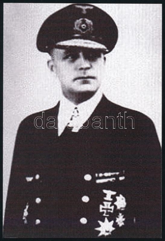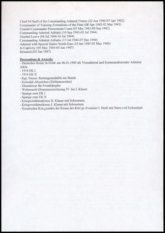 1944 Balkáni harctéri hőstettért matróznak horvát ezüst bátorsági érdemérmet adományozó okirat Joachim Lietzmann az Adriai-flotta vice-admiralisának saját kezű aláírásával, valamint a hőstett leírásával. Mellékelve az admirális életrajza és fotója / Document awarding sailor with the Croatian silver braveness-medal. His brave deed descibed on the document. Hand signed by vice-admiral Joachim Lietzmann commandr of the Adriatic fleet. Photo and biography in English of the admiral attached.