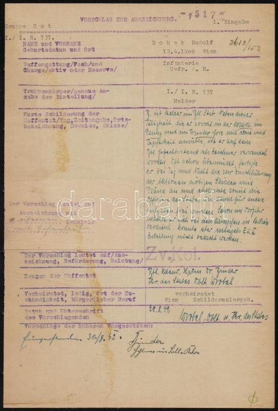 1944 Zvonimir medál adományozó oklevél a Balkáni fronton, Heinrich Borowski híres tábornok aláírásával és a hőstett leírásával