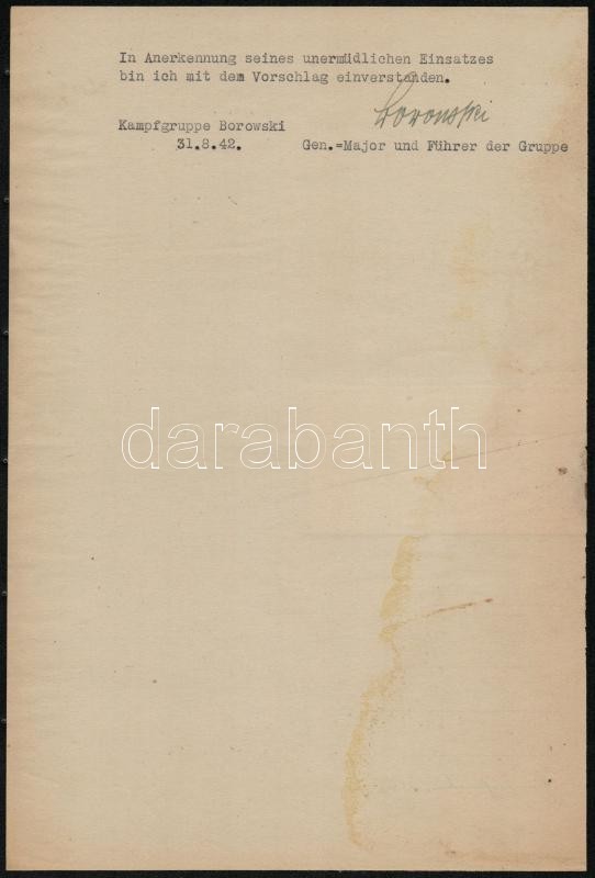 Warrant giving the Iron Zvonimir Medal on the Balcan front signed by commander Borowski