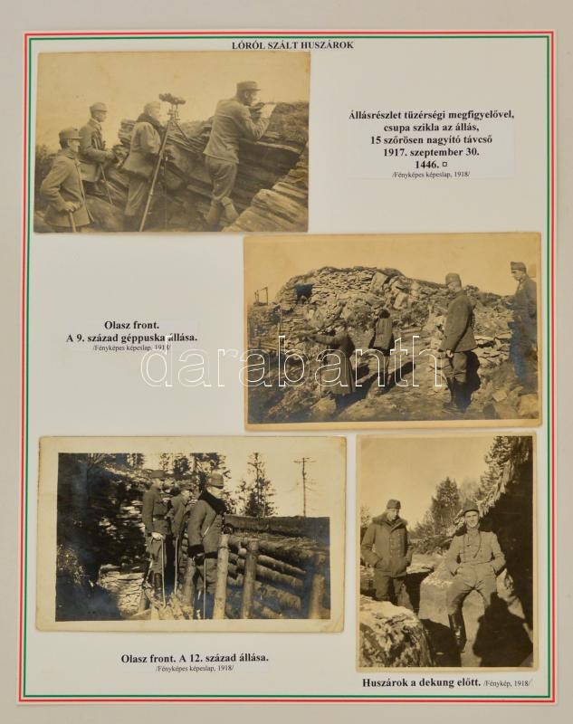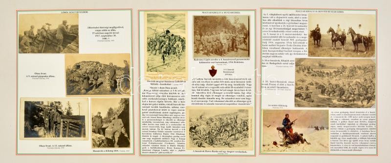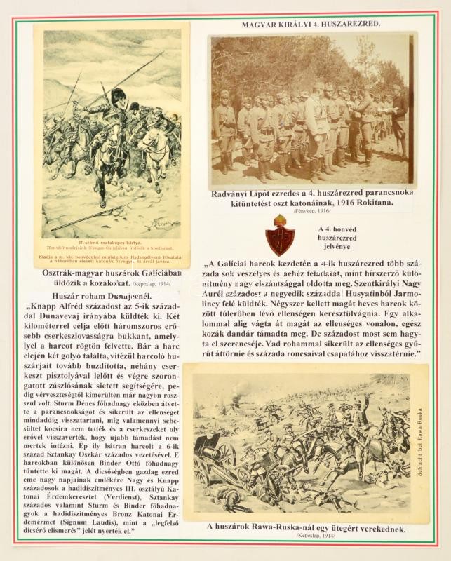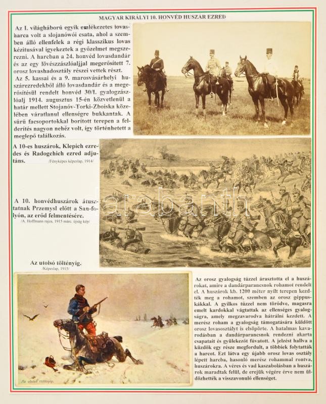Különleges, egyedi összeállÃtás az elsÅ‘ világháborús magyar királyi honvéd huszárok történetérÅ‘l, közte a magyar királyi 4. és 10. honvéd huszárezreddel, 3 db nemzetiszÃn tablón részletes nyomtatott szöveggel, rajta 7 db eredeti képeslappal (képeslap, fotólap (1914-1918)), 2 db eredeti fotóval (1916,1918), 1 db újságkivágással, a képeslapok, fotók nincsenek felragasztva a tablókra. / / Special selection of the history of the Hungarian Royal Hussar Regiments (4th,10th hussar regiments), first world war, with 7 pc. original postcards, 2 pc. original photos, on 3 pc. sheets, not glued on the paper.