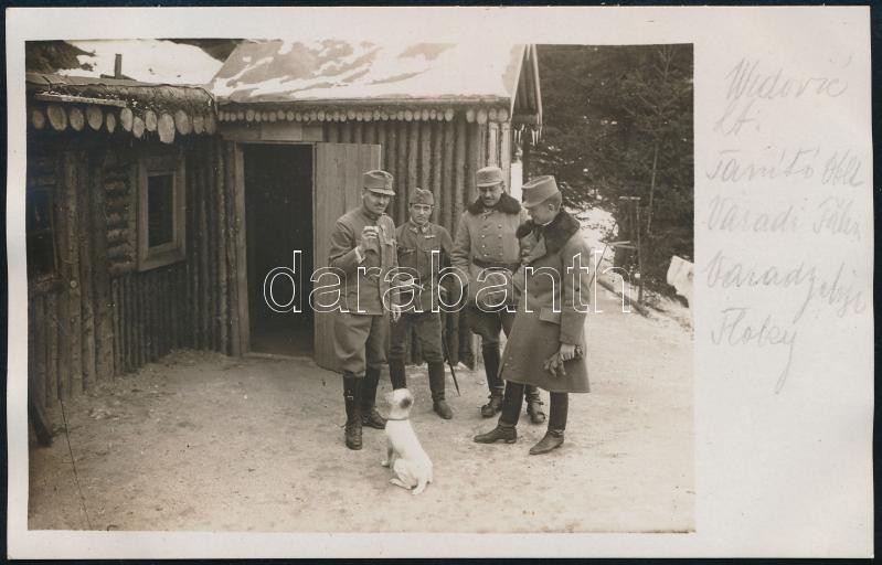 cca 1917 Várady Albert (1870-?) huszártiszt, később ezredes, a m. kir. varasdi 10. honvéd huszárezredből, mókázik a kutyájával tiszttársai körében, fotólap, a szélein feliratozva, 9x cm