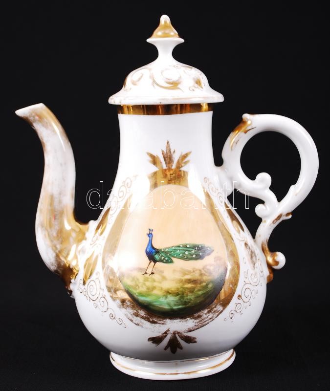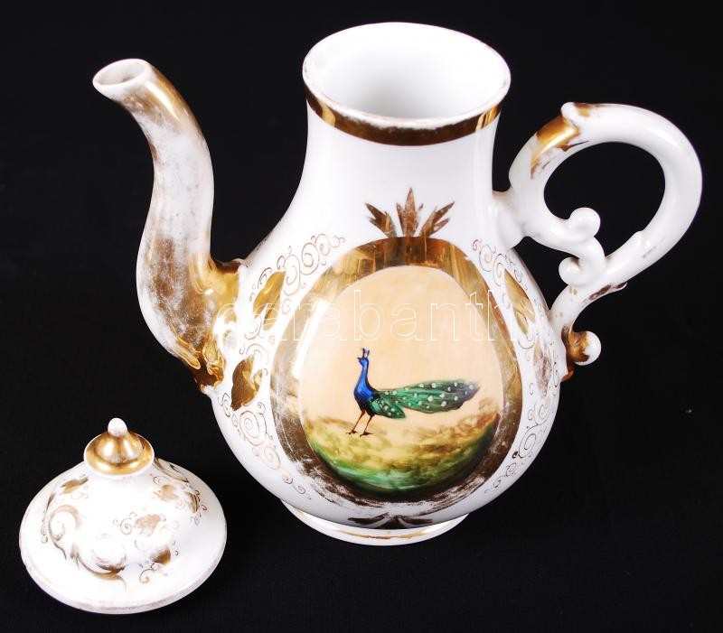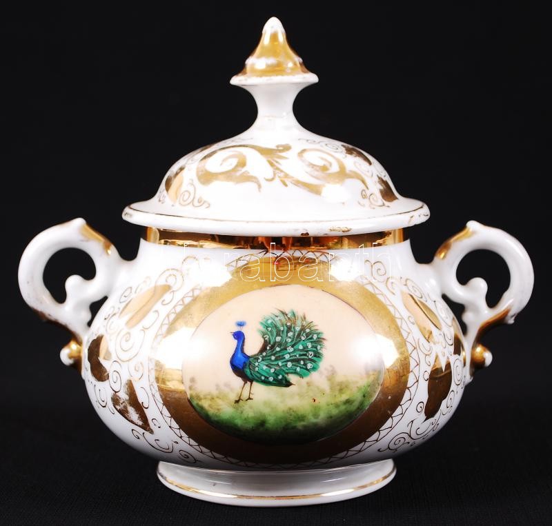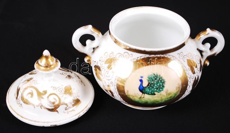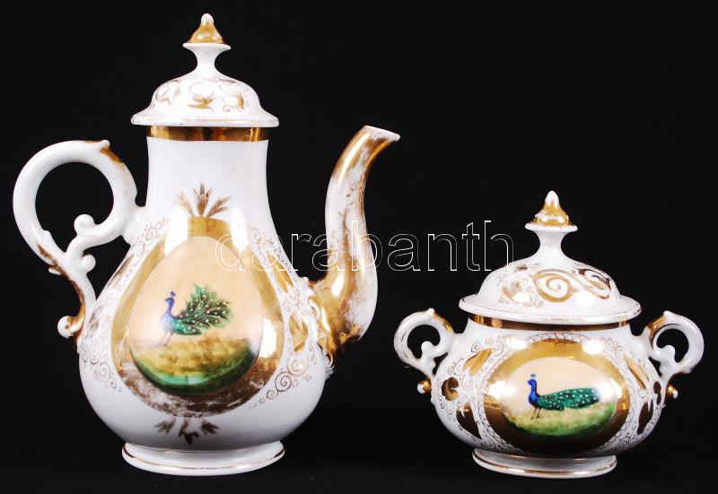 Pávás kiöntő és cukortartó, kézzel festett, gazdagon díszített mintákkal, jelzés nélkül, hibátlan, kopott az aranyozás, m:25 cm, m:16 cm / Antique porcelain sugarbox and spout, perfect condition