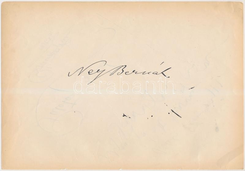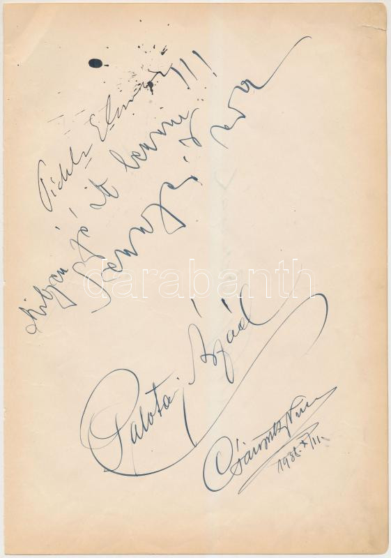1938 Vegyes aláírás tétel ugyanazon papírlap két oldalán, összesen 5db ebből 3db azonosított: Ney Bernát (1863--1938) bariton operaénekes; Pichler Elemér (?-?) tenor, fuvolaművész; Palotay Árpád (1885-1950) basszus, rendező saját kezű aláírása papírlapon, 16x24cm,