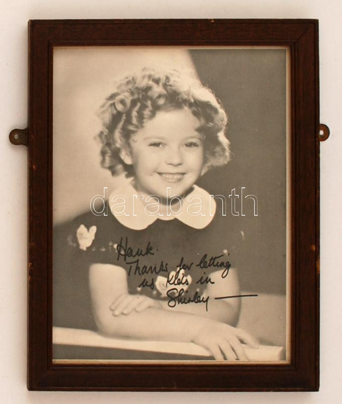 Beschreibung: Shirley Temple (1928- 2014) amerikai gyermekszínész, énekes, táncos saját kezű aláírása egy a művésznőt ábrázoló fotón, üvegezett keretben, 25x20cm