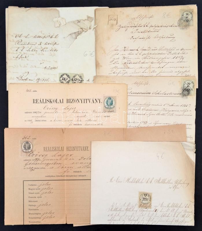 Beschreibung: cca 1850-1880 7 db régi okmánybélyeges irat, benne CM-es is