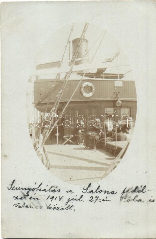 1914 Szunyókálás a "Salona" egycsavaros tengeri személyszállító gőzhajó fedélzetén Pola és Velence között / "Salona" sea passenger steamship, sleeping crew on the board. photo (EK)