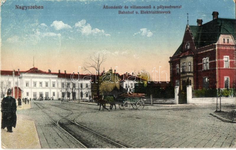 Beschreibung: Nagyszeben, Hermannstadt, Sibiu; Vasútállomás, Állomás tér a Villamosművel / Bahnhof, Elektrizitätswerk / railway station, Electricity work (EK)