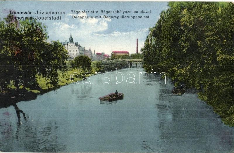 Temesvár, Timisoara; Józsefváros. Béga folyó részlete a Béga szabályozó palotával, csónak / Josefstadt. Bega partie mit Begaregulierungspalast / Iosefin. Bega river with river control regulation palace, boat (EK)