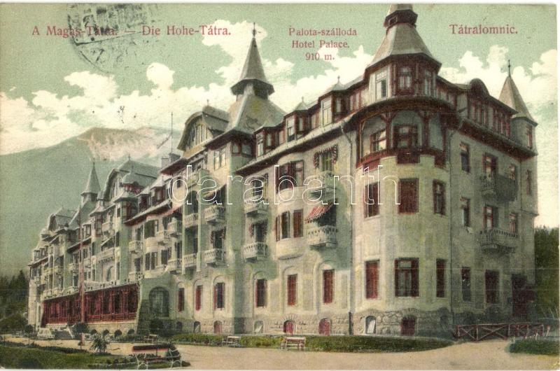 Tátralomnic, Tatranská Lomnica; Palota szálloda. Divald Károly 1907. 1... https://www.darabanth.com/de/329-Fernauktion/329.0/Ansichtskarten/Slowakei~2000007/Tatralomnic-Tatranska-Lomnica-Palota-szalloda-Divald-Karoly-1907-1464-Hotel-Palace~II1837983