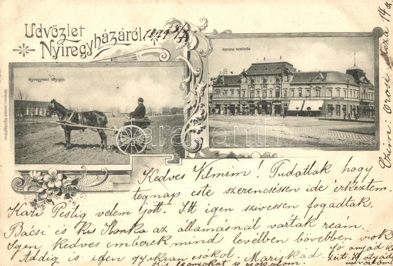1899 Nyíregyháza, , Korona szálloda, talyigás. Ferenczi József Art Nou... https://www.darabanth.com/de/329-Fernauktion/329.0/Ansichtskarten/Ungarn~2000005/1899-Nyiregyhaza-Korona-szalloda-talyigas-Ferenczi-Jozsef-Art-Nouveau-floral~II1788614