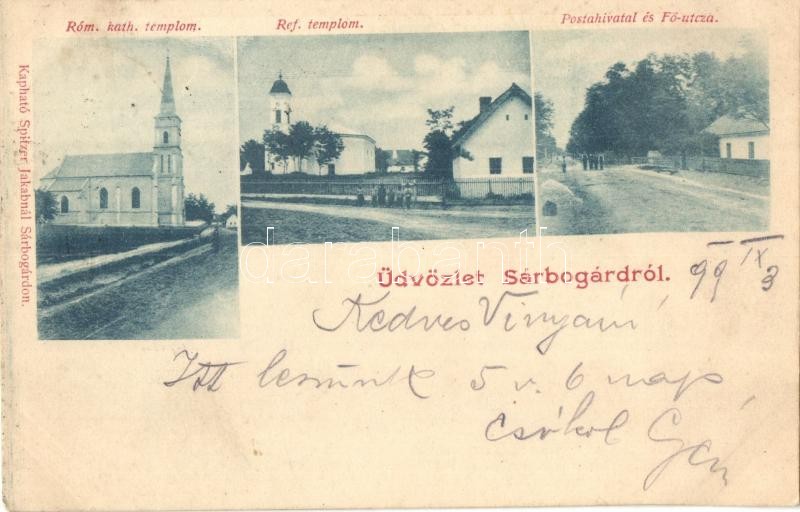 1899 Sárbogárd, Római katolikus és református templom, postahivatal, F... https://www.darabanth.com/de/329-Fernauktion/329.0/Ansichtskarten/Ungarn~2000005/1899-Sarbogard-Romai-katolikus-es-reformatus-templom-postahivatal-Fo-utca-Kaphato-Spitzer~II1788704