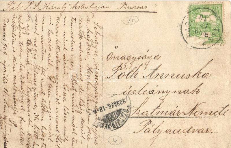 Beschreibung: 1909 Tiszasas, a MÁK (Magyar Állami Kotrások) Károly nevű kotróhajója a Tiszán, a levél írója a hajón. photo