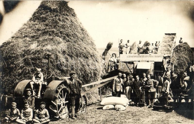 Azonosítatlan magyar város, Mezőgazdasági munka, cséplés, aratás az Első Magyar Gazdasági Gépgyár Rt. (Budapest) gépével, gazda az első mérlegelt áru mellett áll, folklór. photo