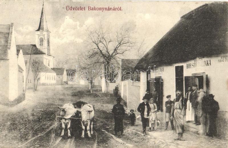 Beschreibung: Bakonynána, utcakép, Római katolikus templom, Deutsch Jakab üzlete, korlátlan bor, sör és pálinka mérés (EK)