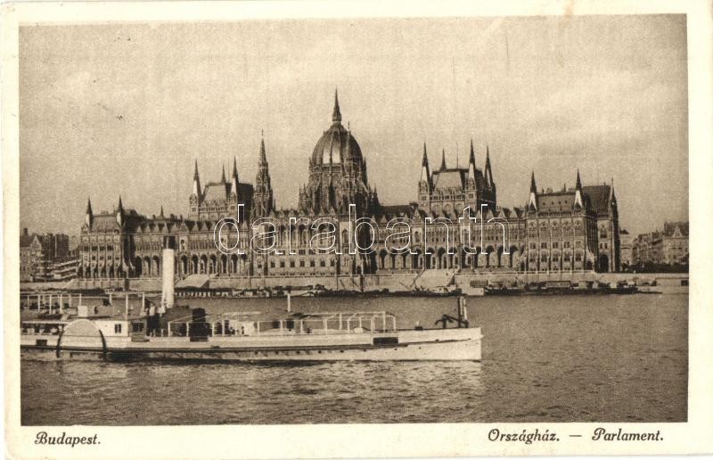 Budapest V. Országház, Parlament, gőzhajó (EK) https://www.darabanth.com/de/329-Fernauktion/329.0/Ansichtskarten/Ungarn~2000005/Budapest-V-Orszaghaz-Parlament-gozhajo-EK~II1612512