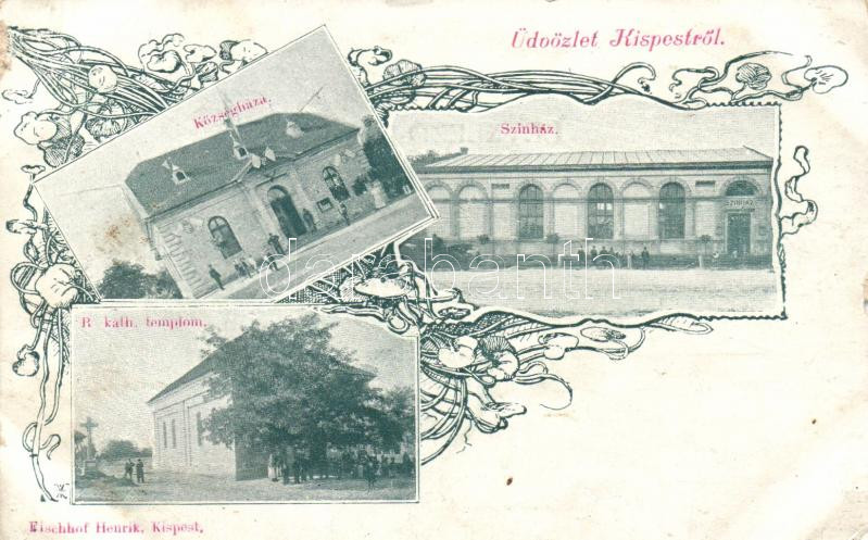 Budapest XIX. Kispest, színház, községháza, templom; floral, kiadja Fi... https://www.darabanth.com/de/329-Fernauktion/329.0/Ansichtskarten/Ungarn~2000005/Budapest-XIX-Kispest-szinhaz-kozseghaza-templom-floral-kiadja-Fischhof-Henrik-konyvnyomd~II802845