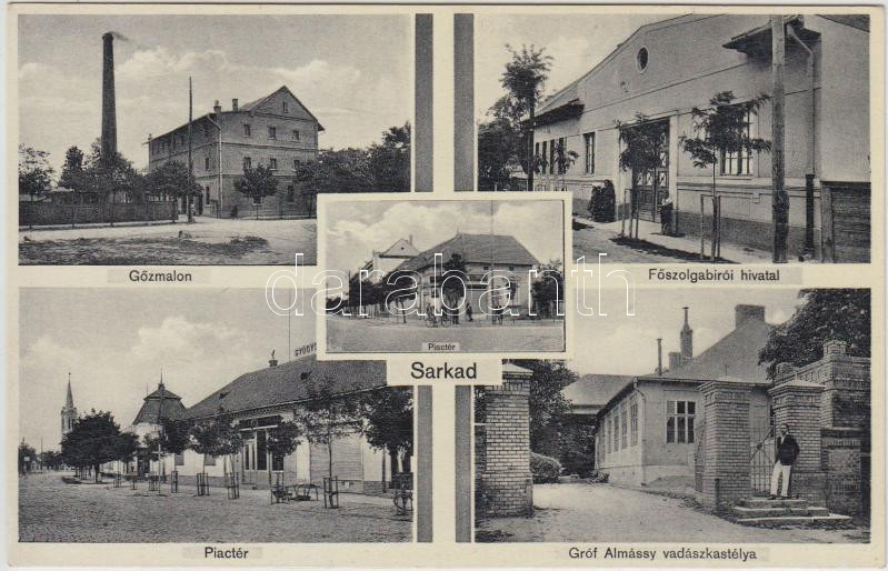 Beschreibung: Sarkad, Gőzmalom, Almássy-vadászkastély, piactér, Főszolgabírói hivatal, gyógyszertár, üzlet