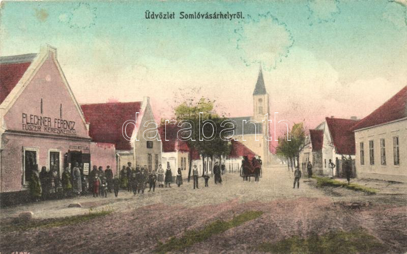 Beschreibung: Somlóvásárhely, Római katolikus templom, Plechner Ferenc fűszer kereskedése, kiadja Siklós Géza fényképész (fl)
