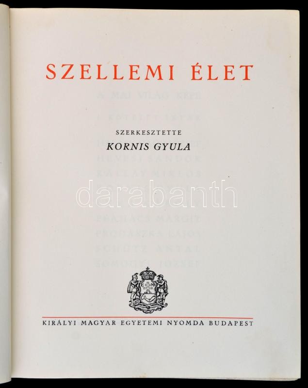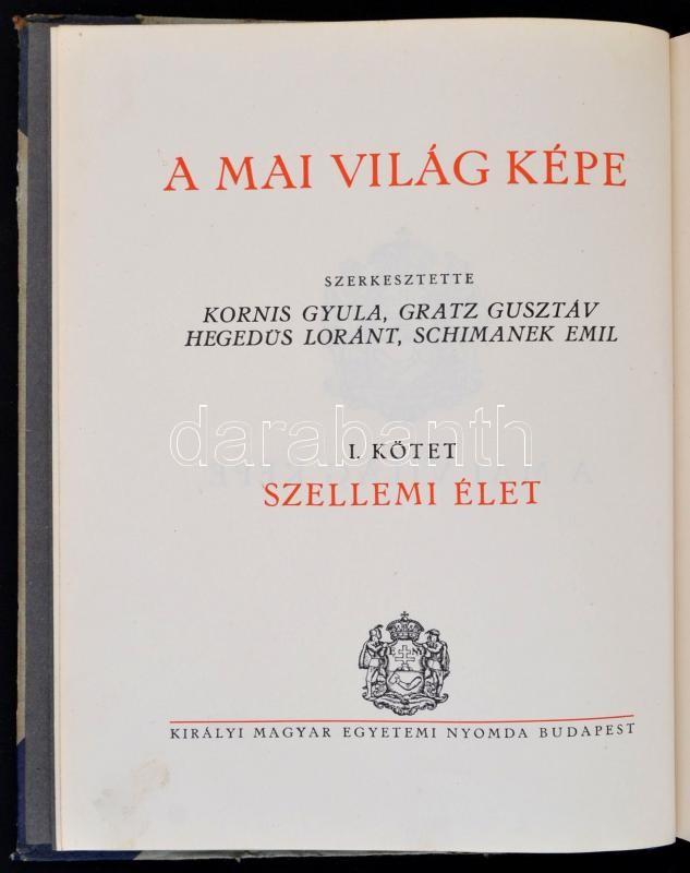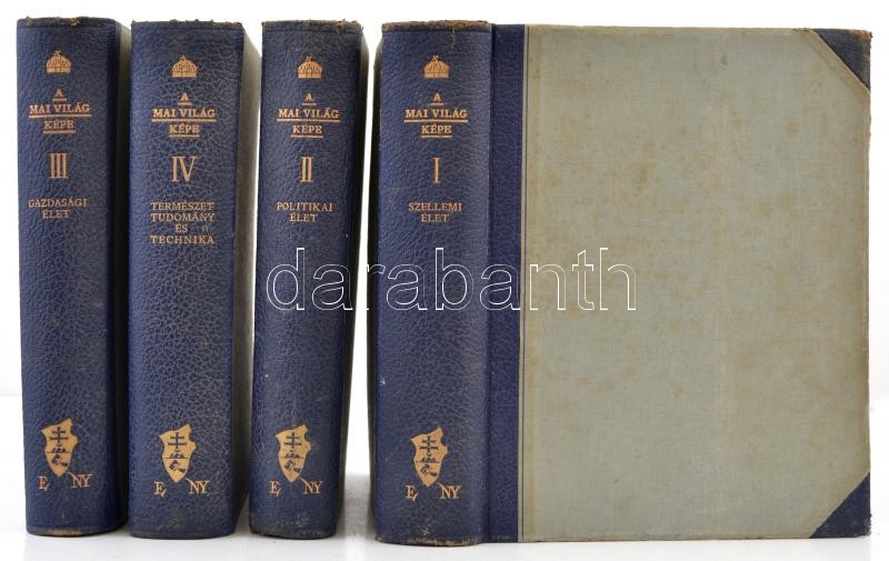 A mai világ képe I-IV. kötet. Szerk.: Kornis Gyula, Gratz Gusztáv, Hegedüs Loránt, Schimanek Emil. I. kötet: Szellemi élet, II. kötet: Politikai élet, III. kötet: Gazdasági élet, IV. kötet: Természettudomány és technika. Bp., é.n., Kir. Magy. Egyetemi Nyomda. Gazdag kép-, térkép-, és ábraanyaggal illusztrálva. Kiadói aranyozott gerincű félbőr-kötésben, kissé kopott borítóval és gerinccel.