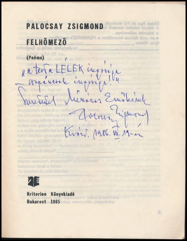 Palocsay Zsigmond: Felhőmező poéma. A szerző, Palocsay Zsigmond (1935-... https://www.darabanth.com/de/329-Fernauktion/329.0/Bucher/Bucher-Andere-kuriositaten~1000018/Palocsay-Zsigmond-Felhomezo-poema-A-szerzo-Palocsay-Zsigmond-1935-1994-altal-dedikaltplusKa~II1791193