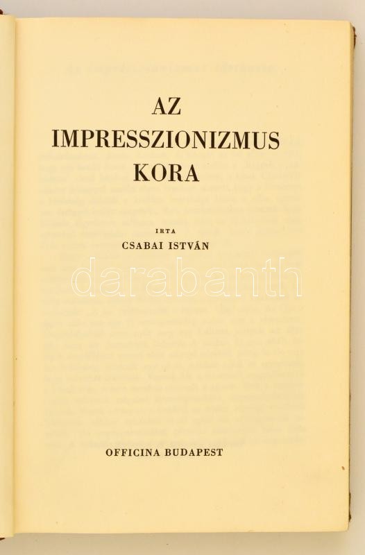 Csabai István: Az impresszionizmus kora. Bp., 1942, Officina. Félvászo... https://www.darabanth.com/de/329-Fernauktion/329.0/Bucher/Bucher-Architektur-Kunst~1000006/Csabai-Istvan-Az-impresszionizmus-kora-Bp-1942-Officina-Felvaszon-kotes-sarkain-kopott-~II1791798