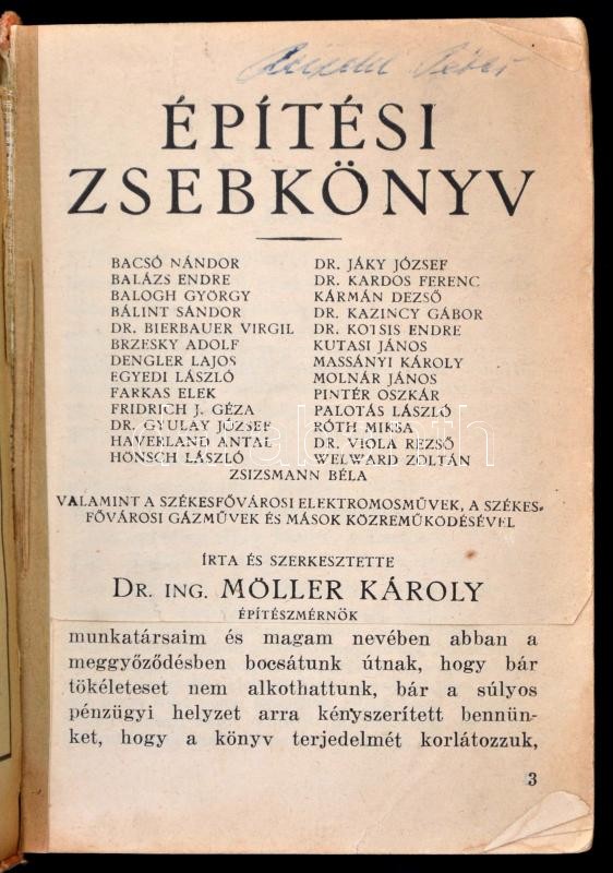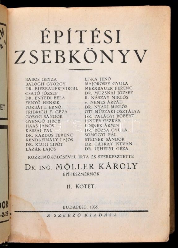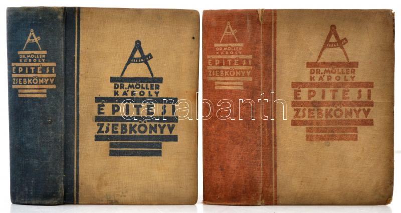 Építési zsebkönyv I-II. Szerk.: Dr. Möller Károly. Bp., 1934-1935, Szerzői kiadás,(Királyi Magyar Egyetemi Nyomda), 1200+XL+1087+XIV p. Kiadói egészvászon-kötésben, kopott borítóval, a II. kötet foltos.