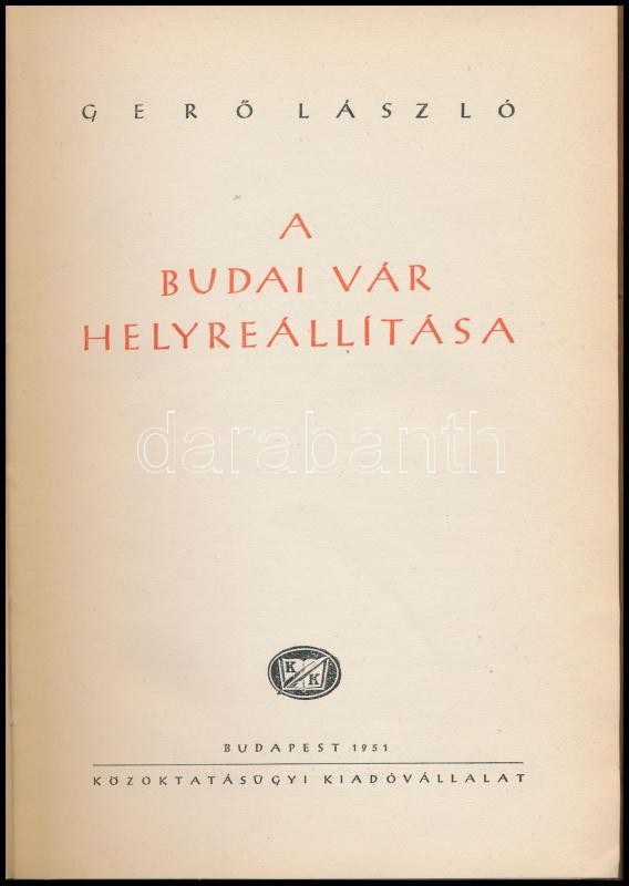 Gerő László: A budai vár helyreállítása. Bp.,1951, Közoktatásügyi Kiad... https://www.darabanth.com/de/329-Fernauktion/329.0/Bucher/Bucher-Architektur-Kunst~1000006/Gero-Laszlo-A-budai-var-helyreallitasa-Bp-1951-Kozoktatasugyi-Kiadovallalat-Kiadoi~II1791860