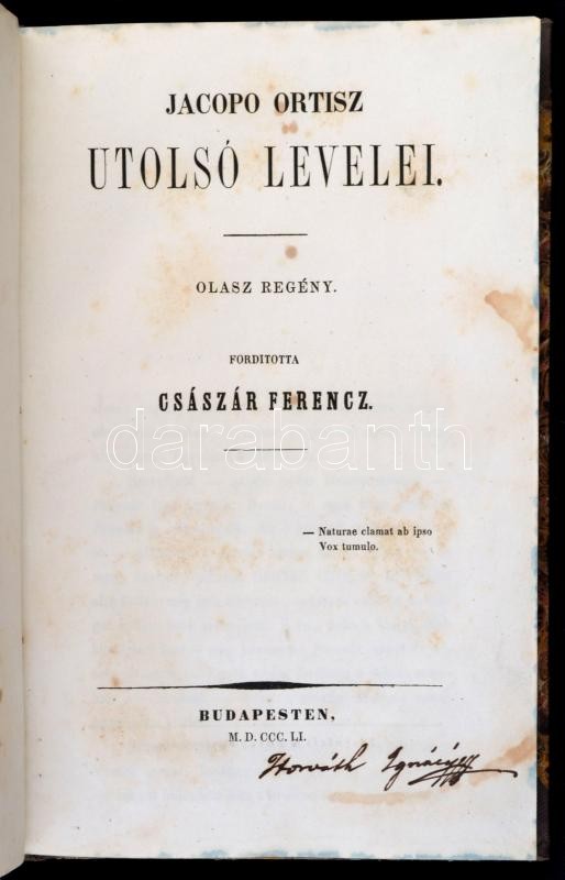 Ugo Foscolo (1778-1827): Jacopo Ortisz utolsó levelei. Bp., 1851, Eisenfels és Emich-ny., 150+2 p. Első kiadás. Korabeli félvászon-kötés, kissé kopott borítóban, foltos lapokkal.
