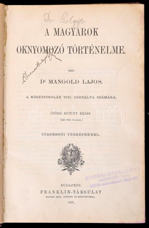Dr. Mangold Lajos: A magyarok oknyomozó történelme. A középiskolák VIII. osztálya számára. Történeti térképekkel. Bp., 1907., Franklin, 374 p.+2 térkép. Korabeli kopottas félvászonkötés, kissé foltos lapélekkel, 3 térkép hiányzik, de belül alapvetően jó állapotban.