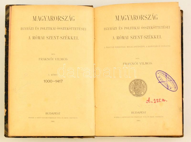 Fraknói Vilmos: Magyarország egyházi és politikai összeköttetései a Római Szentszékkel a Magyar Királyság megalapításától a konstanczi zsinatig I. kötet: 1000-1417. Bp., 1901, Szent István Társulat, XVI+404 p. Átkötött kopottas félvászon-kötés, intézményi bélyegzővel.