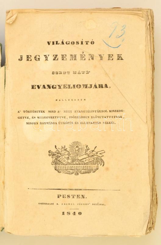Világosító jegyzemények Szent Máté evangyeliomára, mellyekben a' történetek mind a' négy evangyélistákból kiszedegetve, és megegyeztetve, időrendben előmutattatnak, minden egymásba ütközés és ellenkezés nélkül. Pest, 1840, Reimel József-ny., XX+502+2 p. Kiadói papírkötésben, megviselt állapotban, szakadozott,sérült, hiányos borítóval, a könyv végén pár lap sérült, hiányos, négy oldal alján (470.,478.,494.,500.) a szövegnél pici hiánnyal, de ezeket leszámítva a szöveg épp, és hiánytalan, kissé foltos, felvágatlan lapokkal. Ritka!