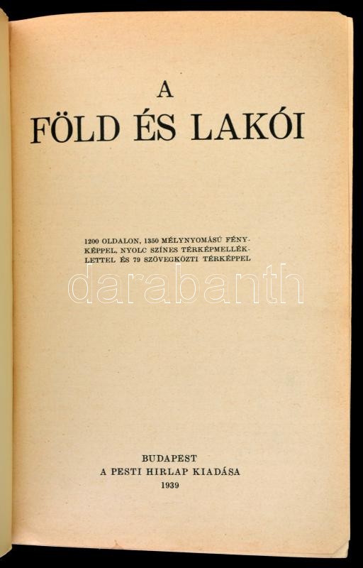 A Pesti Hírlap Könyvtára: A Föld és lakói. 1200 oldalon, 1350 mélynyomású fényképpel, 8 színes térképmelléklettel, 75 szövegközti térképpel. Bp., 1939, Pesti Hírlap. Kiadói aranyozott egészvászon-kötésben, kopott borítóval.