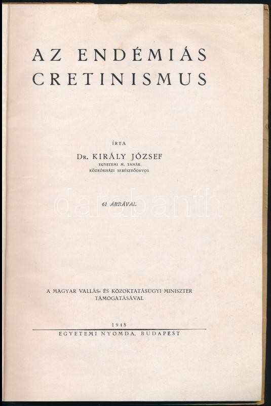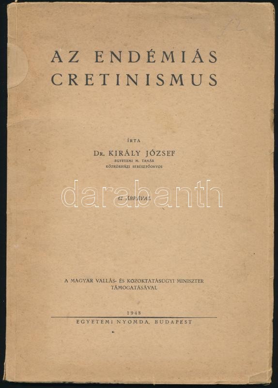 Dr. Király József: Az endémiás cretinismus. Bp., 1948, Egyetemi Nyomda, 63 p. Kiadói papírkötés, foltos.